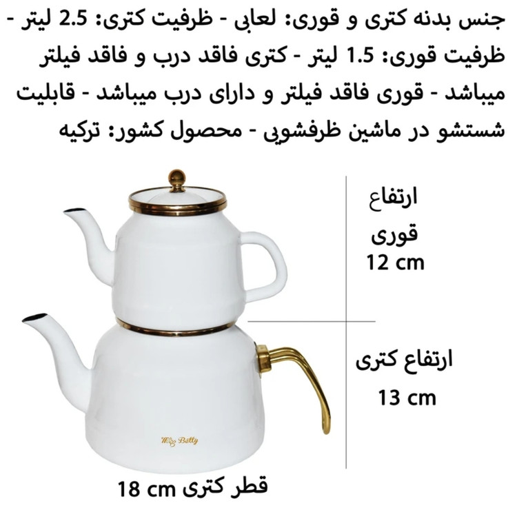 ست کتری و قوری از برند میس بتی miss Betty ساخت کشور ترکیه با حجم کتری ۲.۵ لیتر و حجم قوری ۱.۵ لیتر یکی از ترند ترین و زیبا ترین کتری و قوری های حال حاضر بازار ایران هستش که جنس لعابی کاملا ضخیم و ضد زنگ و ضد برگشت رنگ بودنش خیلی خاصش میکنه و شما میتونید این کتری و قوری رو با ضمانت اصالت و کیفیت از فروشگاه کوچینی خریداری کنید.